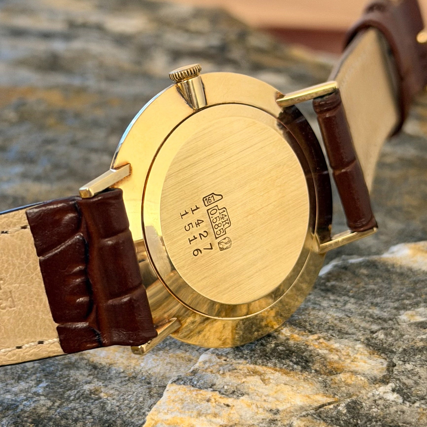 The case is crafted from solid 14K gold (585 hallmark). Since the watch has neither been worn nor polished, the case edges remain perfectly sharp, and the hallmarks on the caseback are impressively crisp. The gold is free from the characteristic "spiderweb" of micro-scratches, serving as the ultimate proof of its careful collector storage.