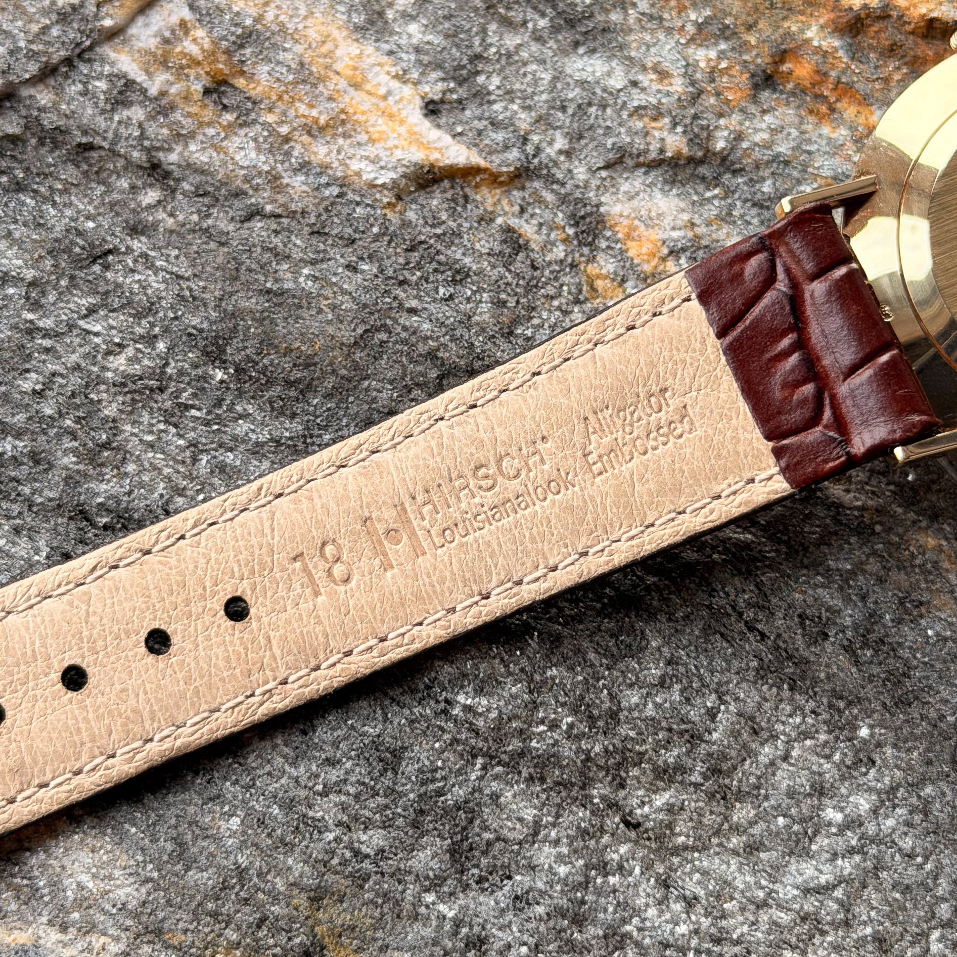 Completing the look is a high-end strap from the Austrian brand HIRSCH. The model, from the "Louisianalook" series (alligator embossing) in a noble brown, perfectly complements the warm tone of the gold case.