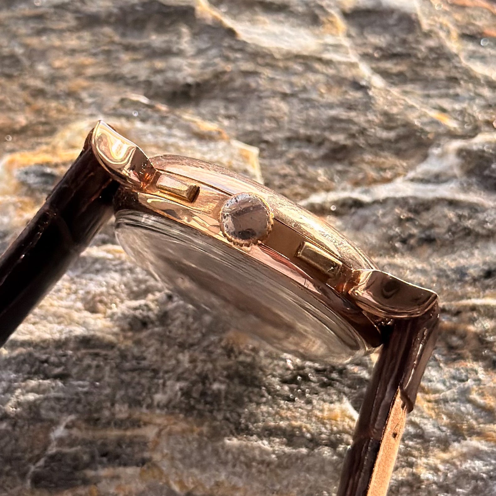 Цей золотий хронограф Dulcia 1950-х років одразу приковує погляд своєю нетривіальною естетикою, головною родзинкою якої є рідкісна форма корпусу типу «Краб».