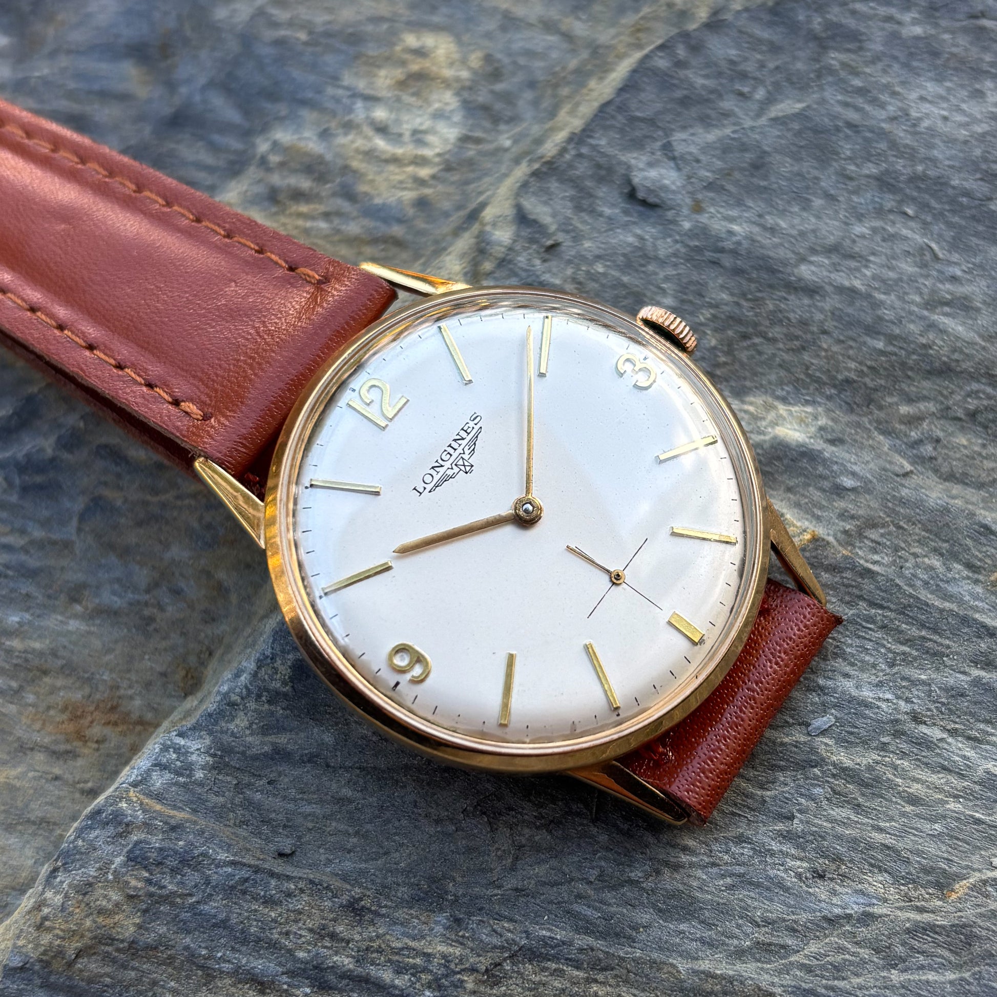 Inside beats a true legend of the horological world, the manufacture caliber 30L. Collectors consider this to be one of the finest and most reliable manual-wind movements ever produced by Longines. A classic brown leather strap harmoniously complements the gold case, completing the look of a flawless gentleman’s accessory that blends jewelry-grade value with mechanical perfection.