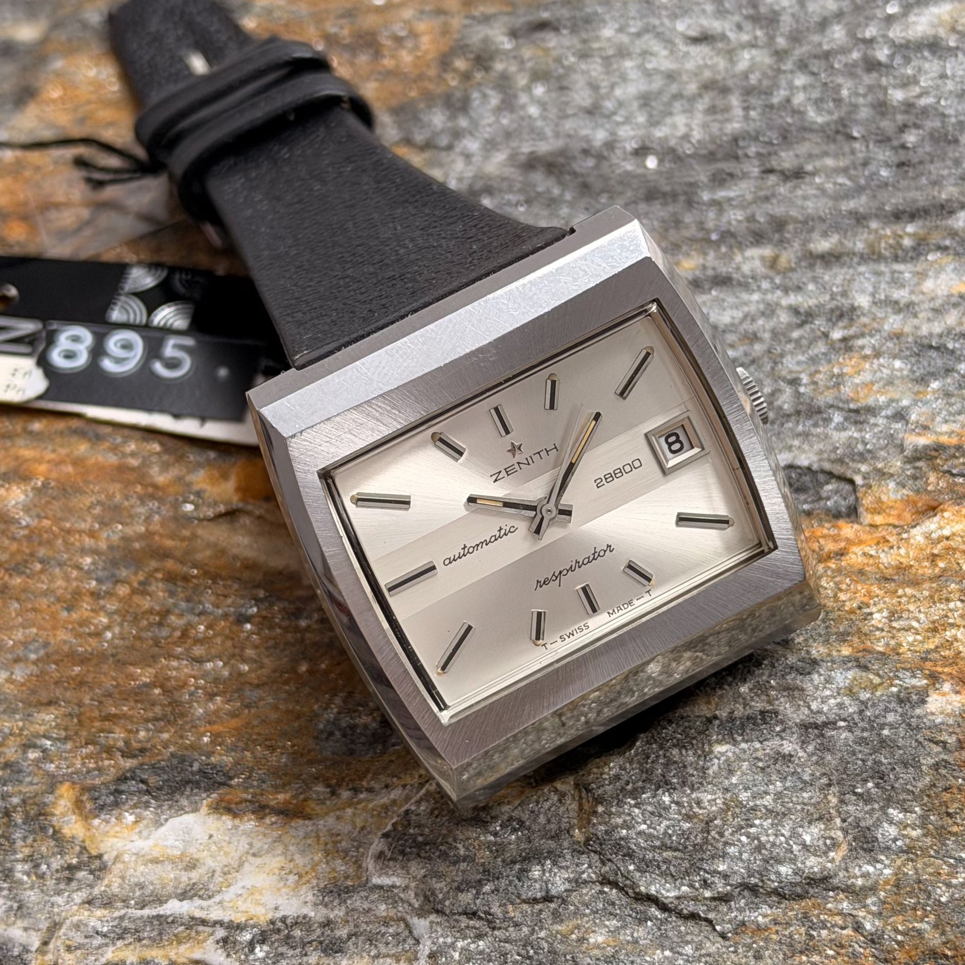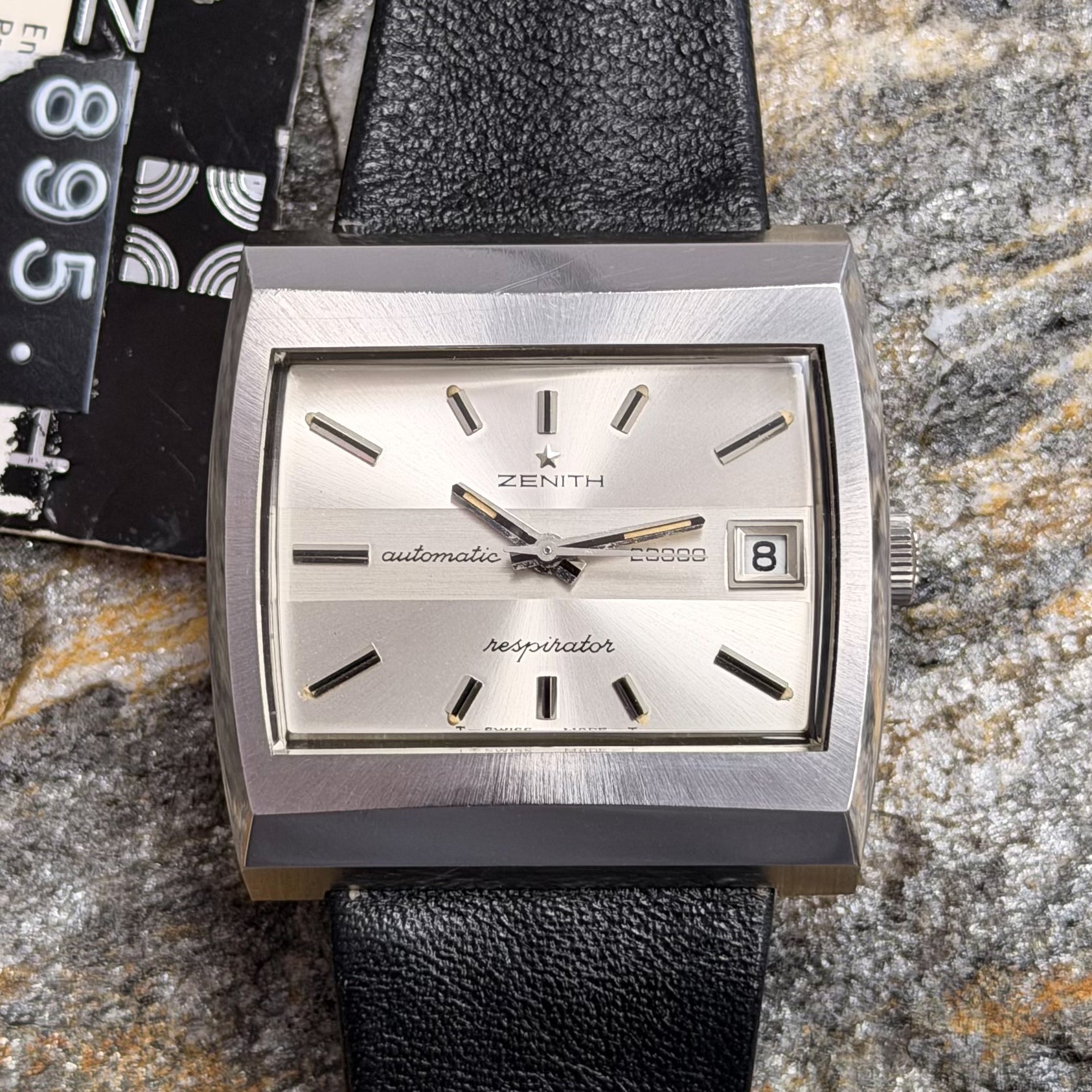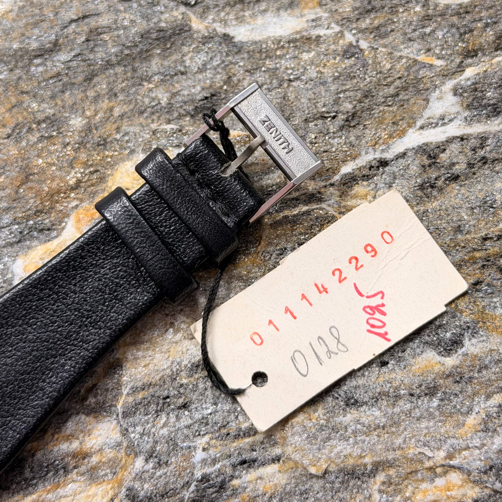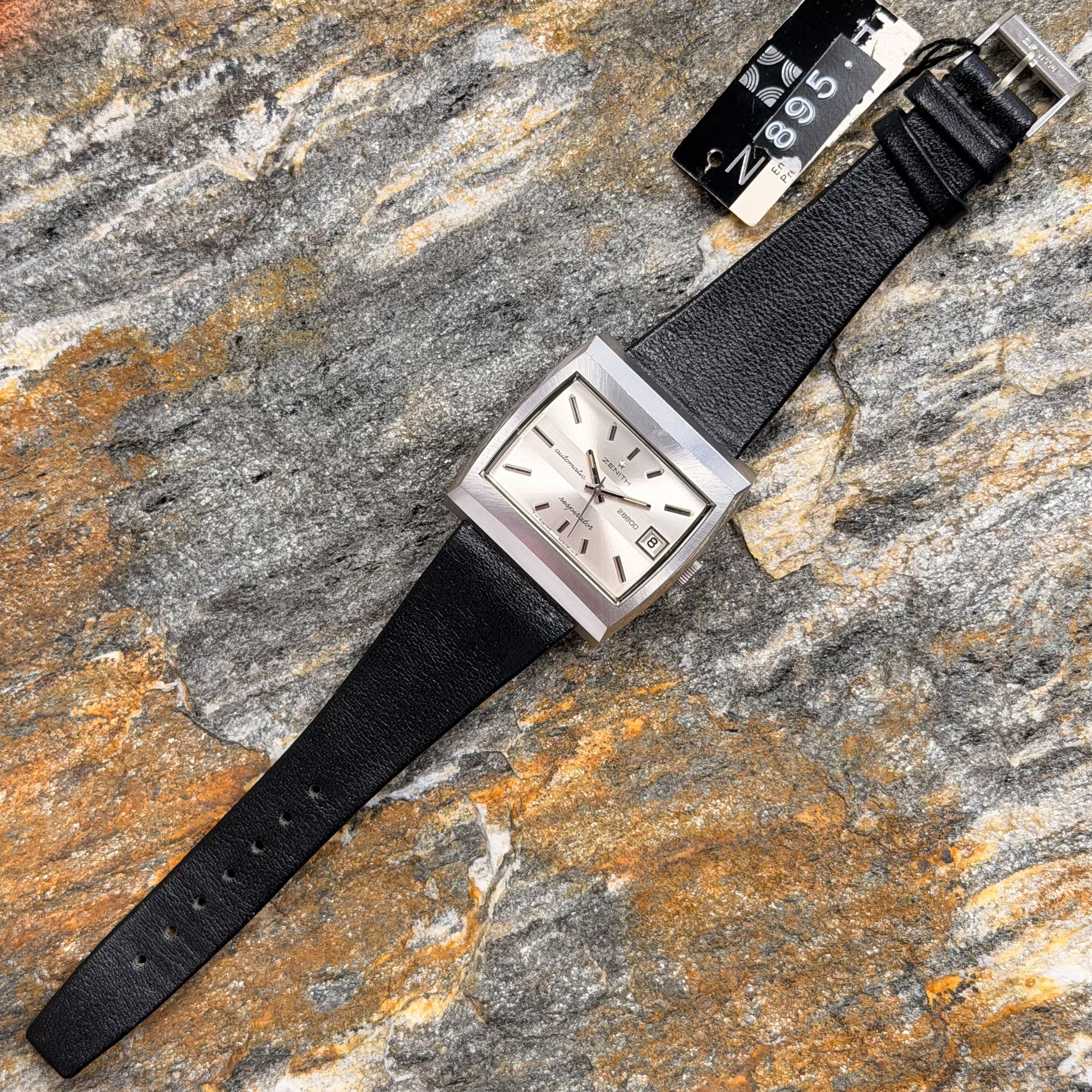 This rare specimen holds significant investment and horological value, offered in its full authentic set: complete with the original black Zenith leather strap, branded buckle, and factory hangtag-exactly as it left the manufacture in Le Locle over 50 years ago.