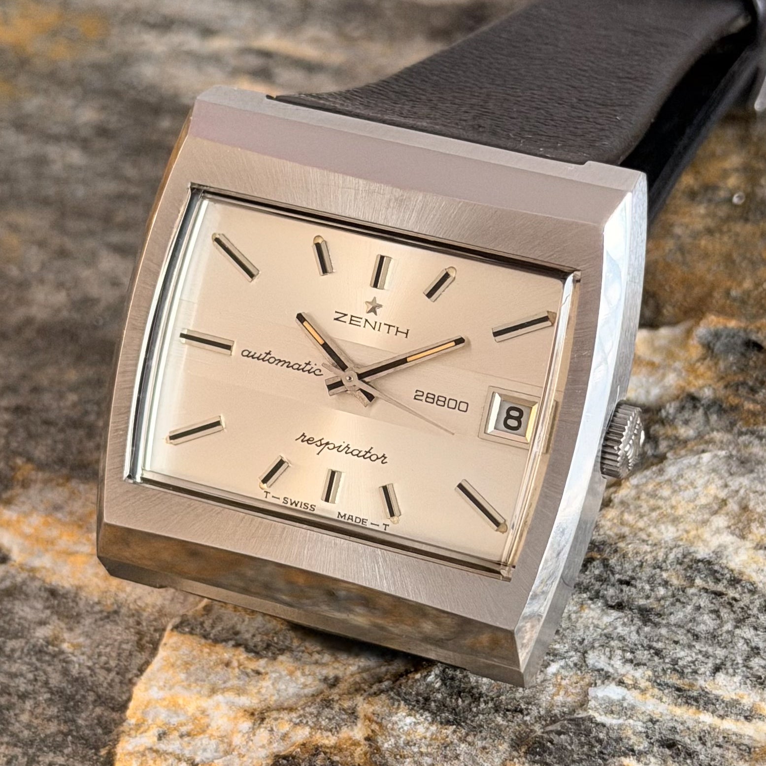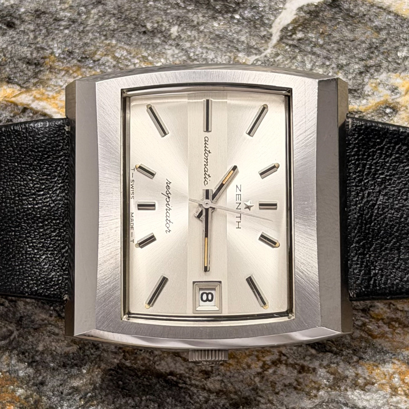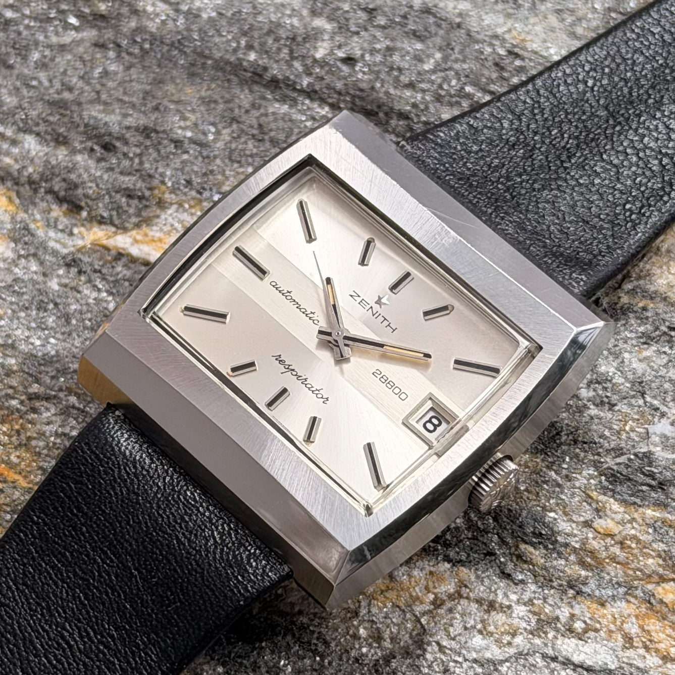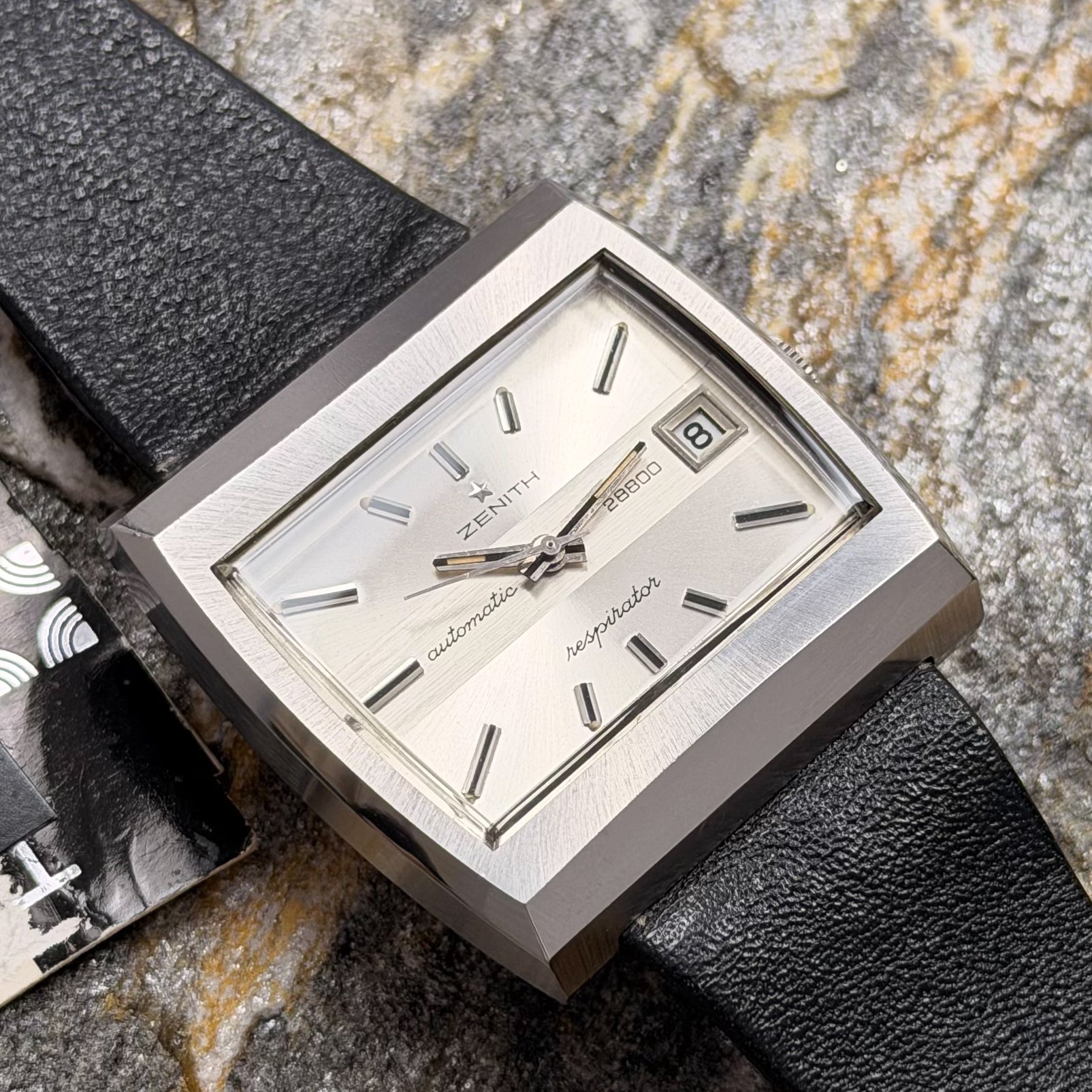 This rare specimen holds significant investment and horological value, offered in its full authentic set: complete with the original black Zenith leather strap, branded buckle, and factory hangtag-exactly as it left the manufacture in Le Locle over 50 years ago.