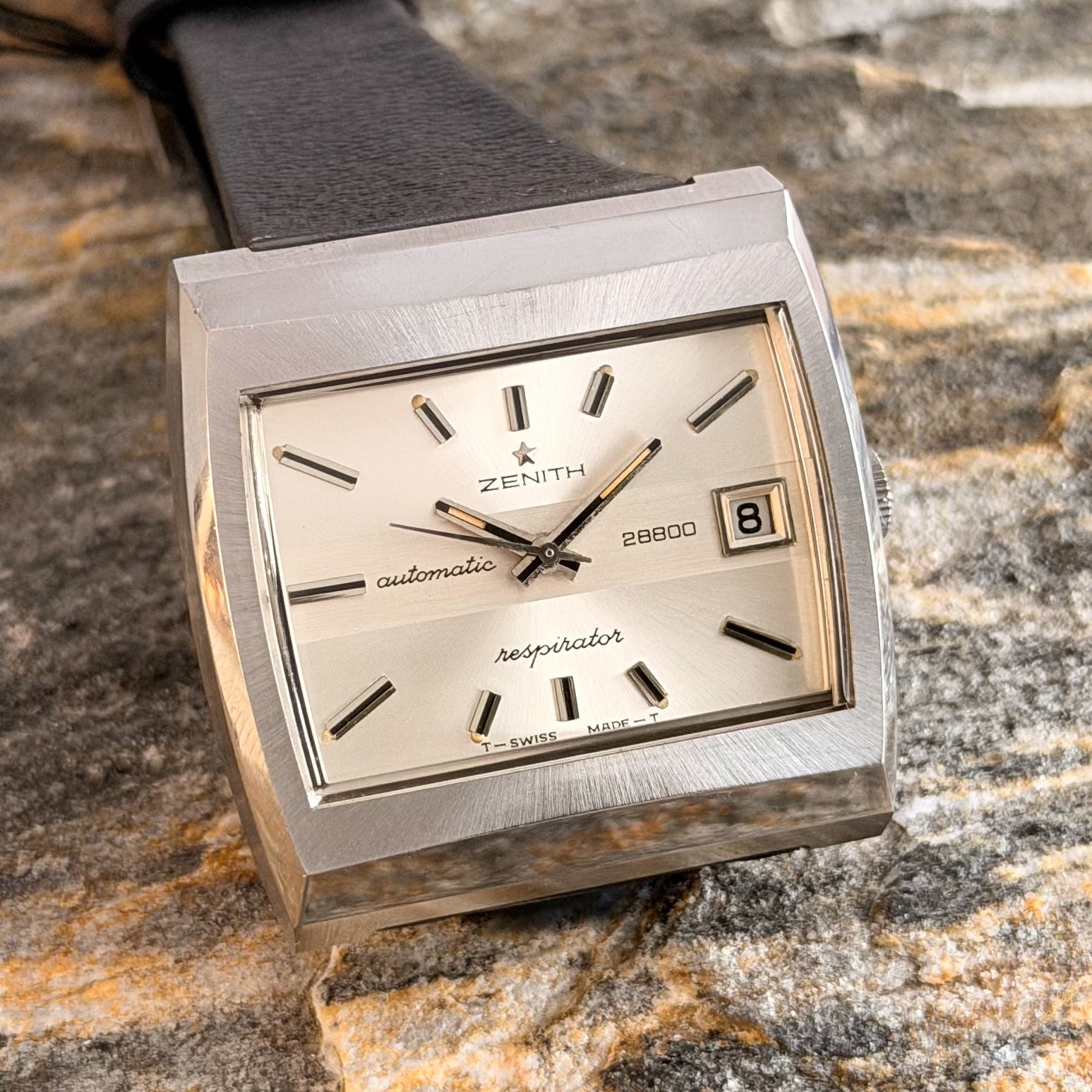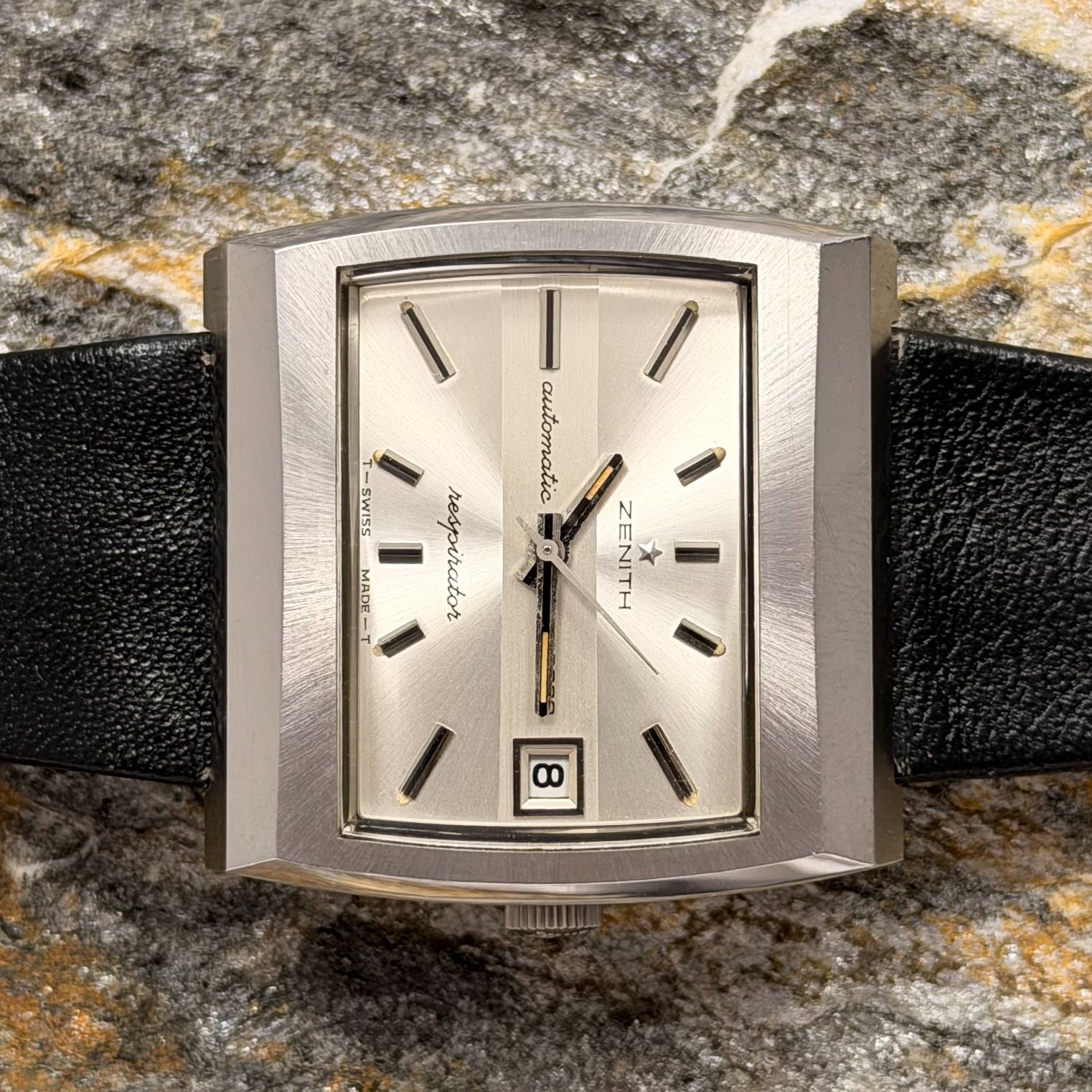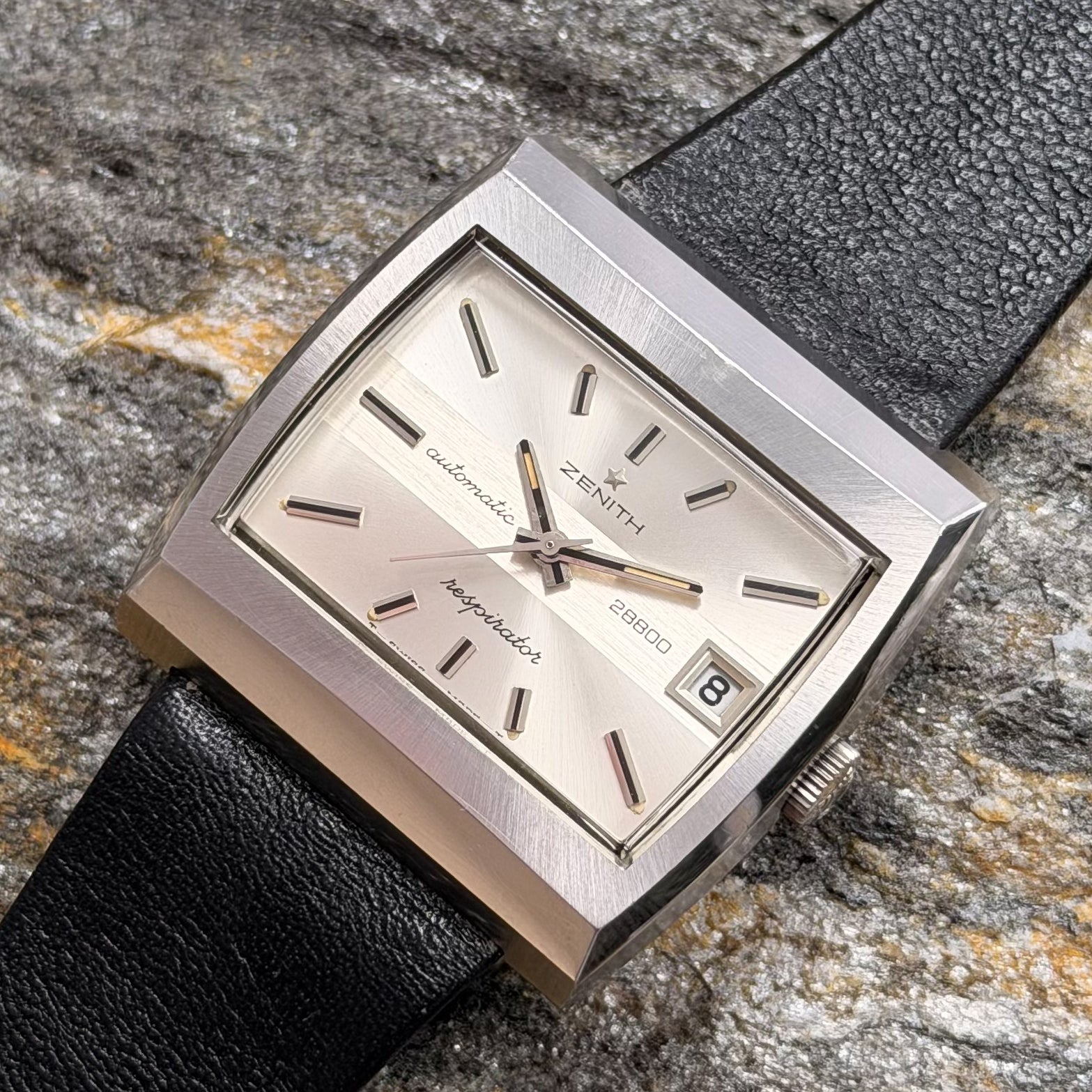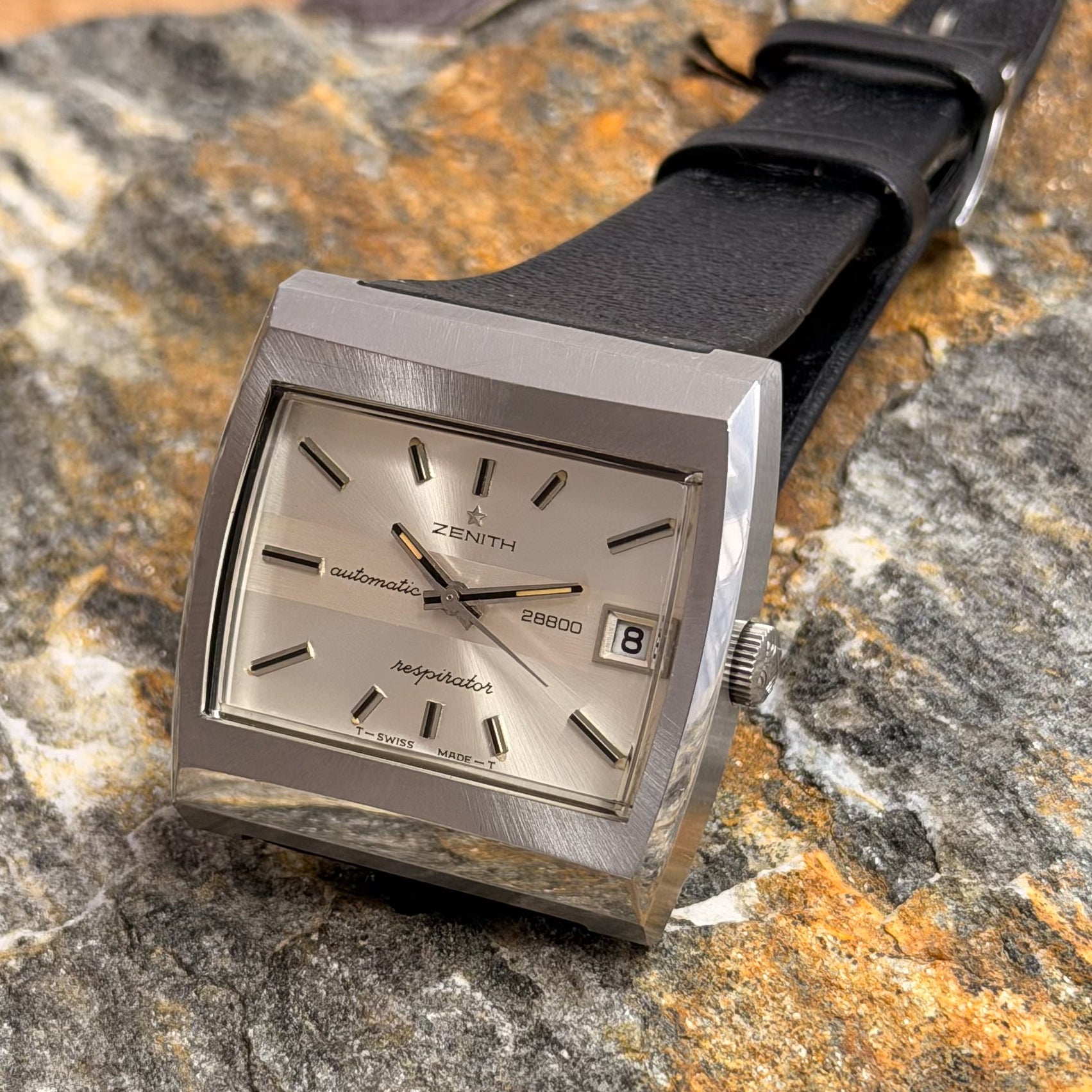 This rare specimen holds significant investment and horological value, offered in its full authentic set: complete with the original black Zenith leather strap, branded buckle, and factory hangtag-exactly as it left the manufacture in Le Locle over 50 years ago.