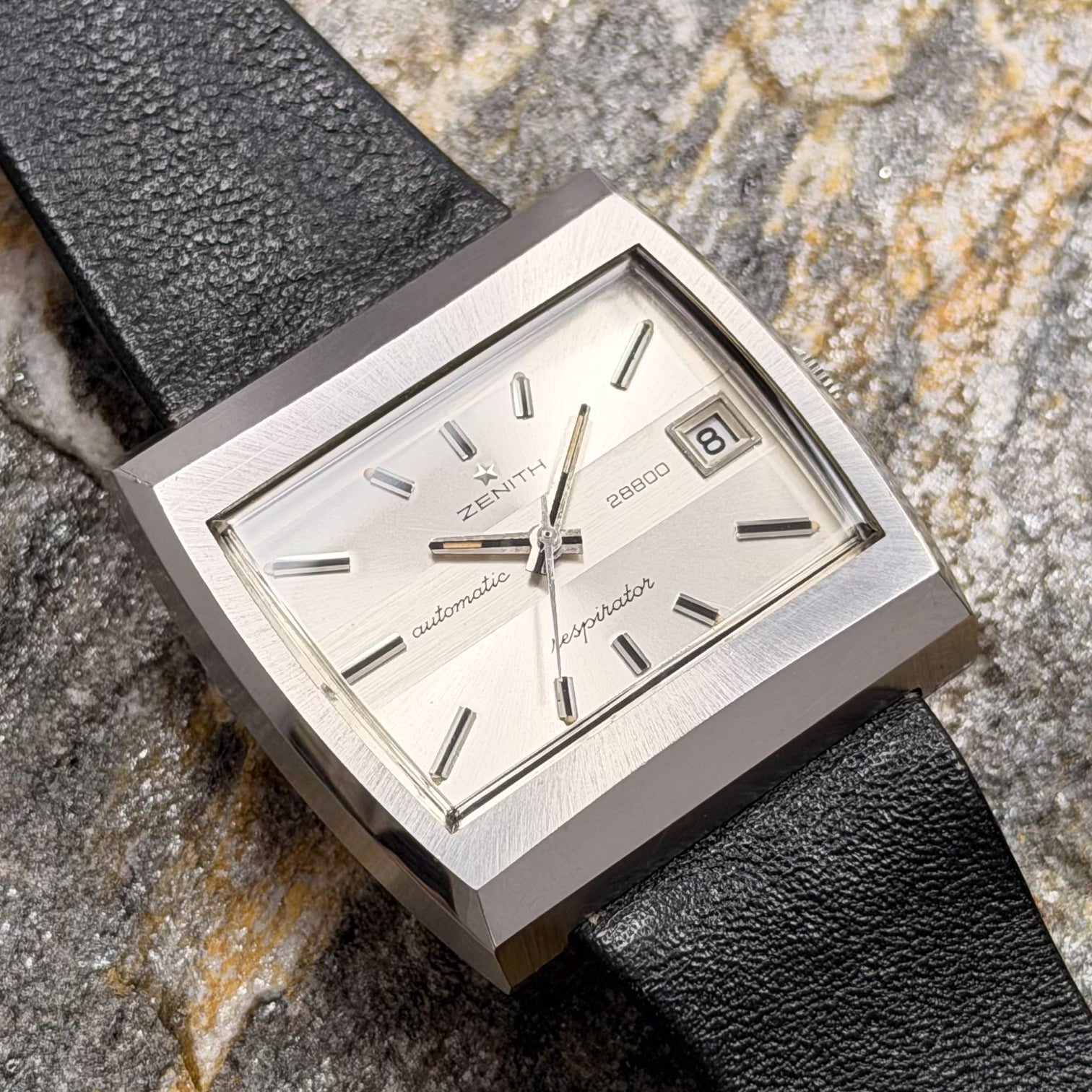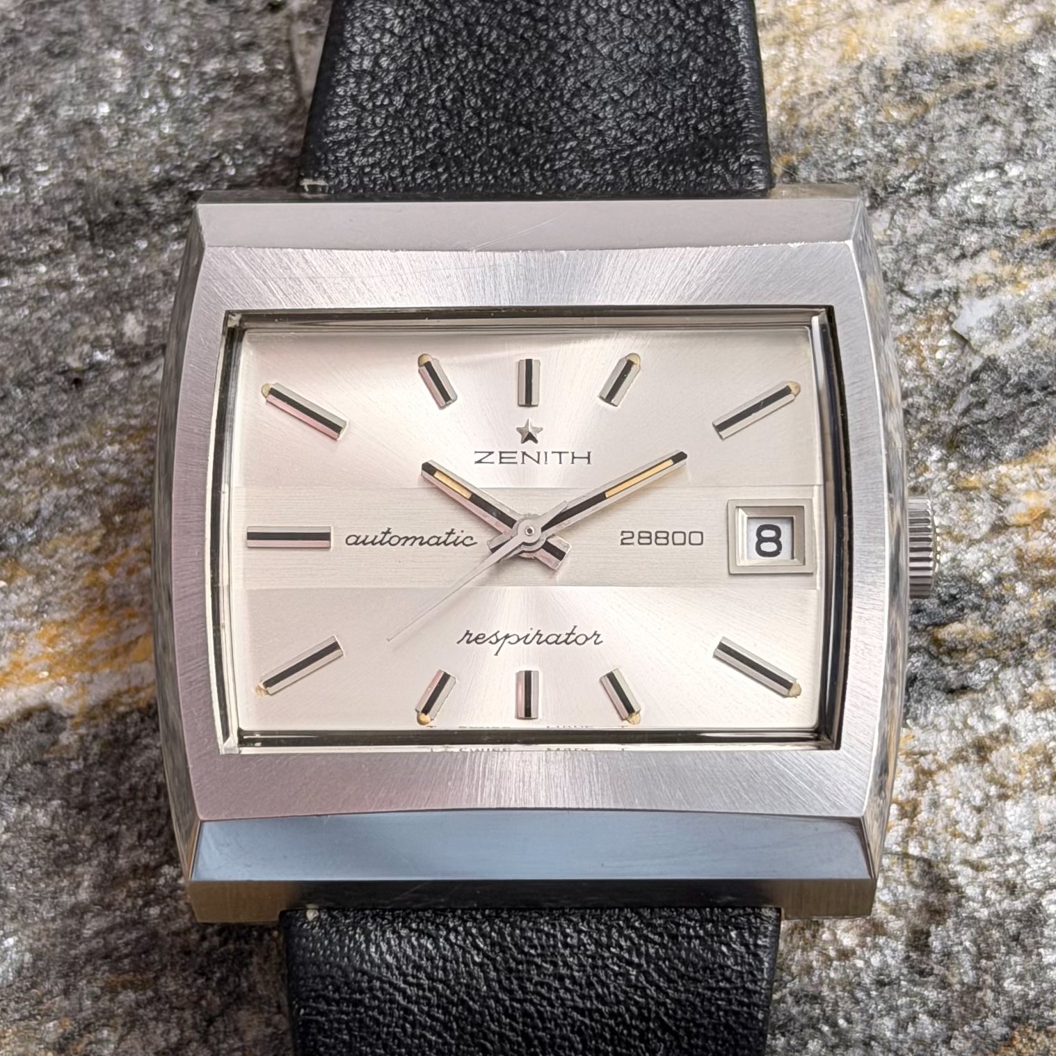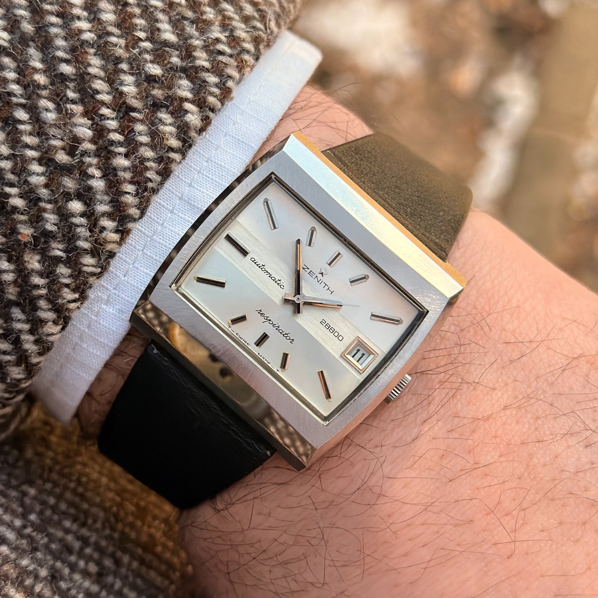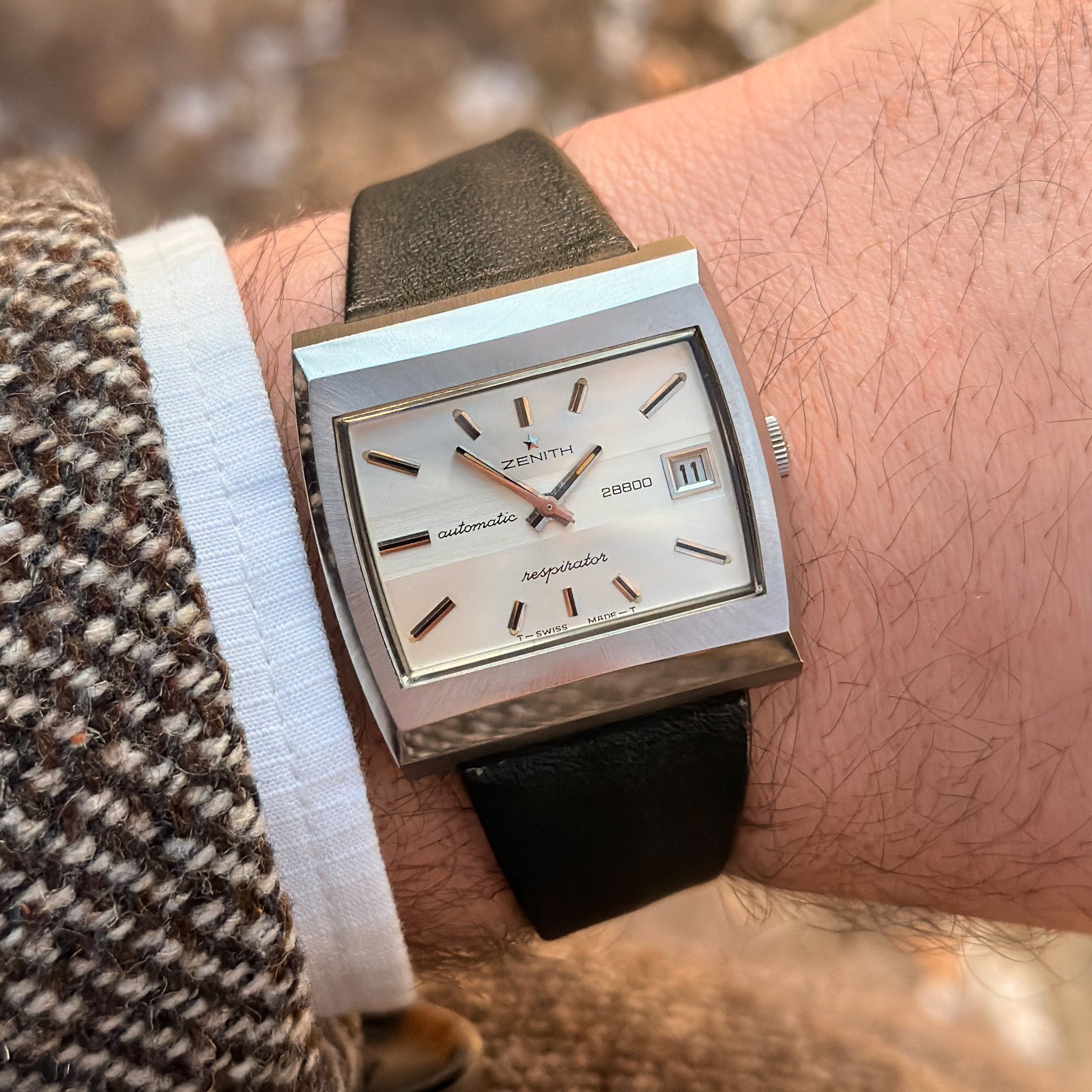 This rare specimen holds significant investment and horological value, offered in its full authentic set: complete with the original black Zenith leather strap, branded buckle, and factory hangtag-exactly as it left the manufacture in Le Locle over 50 years ago.