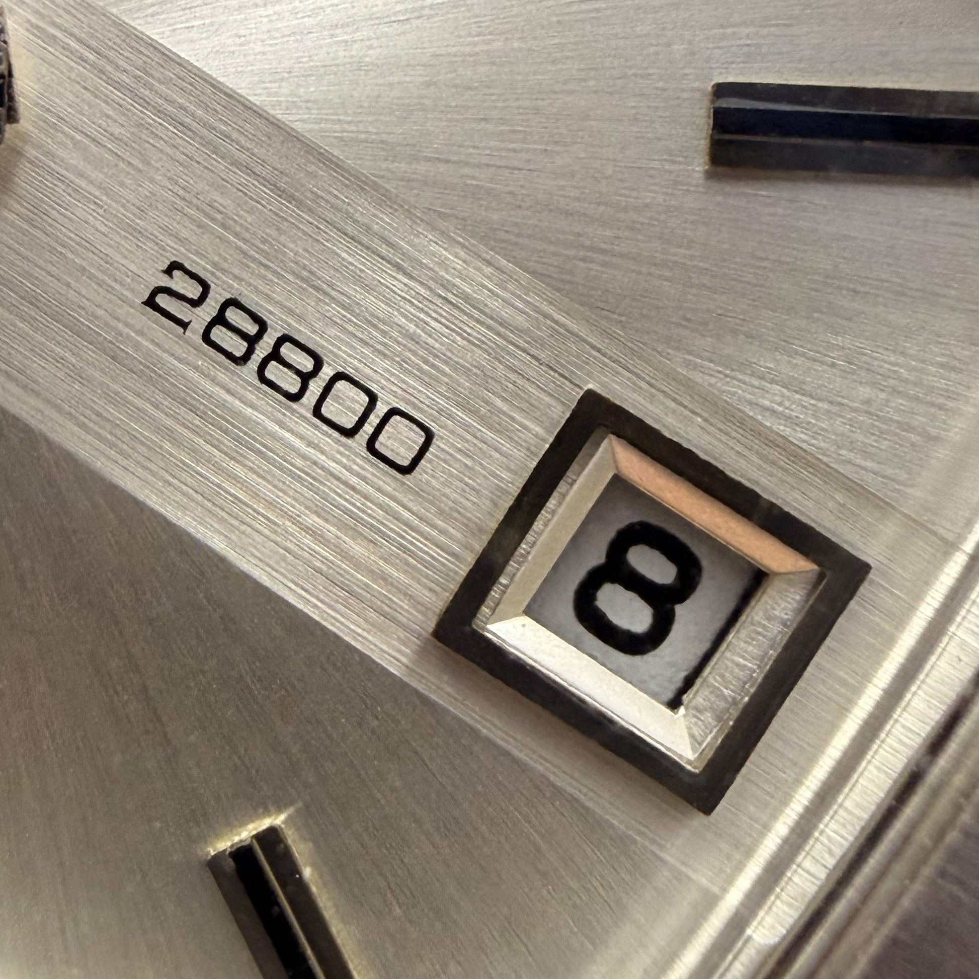 Presented in unworn NOS condition, the watch shows only minor storage marks-the ultimate certificate of authenticity for a serious collector. The silver satin-finished dial impresses with its clean geometry, while the "28800" signature points to the high-performance heart beating within.